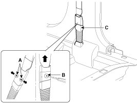 2. To remove the seat belt anchor pretensioner, keep on pushing the lock pin (A) as arrow direction. And then remove the seat belt after pushing the lock pin (B).