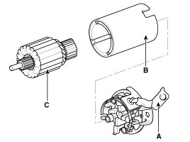 4. Remove the brush holder assembly (A), yoke (B) and armature (C).
