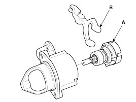 Check that there is no continuity between the (+) brush holder (A) and (-) plate (B). If there is continuity, replace the brush holder assembly.