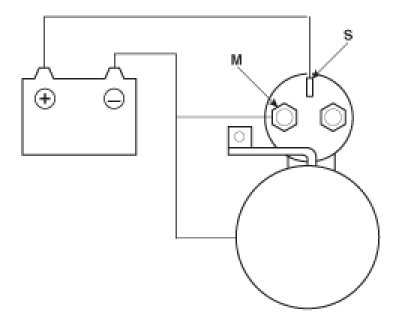 4. Disconnect the connector from the S-terminal of solenoid. Connect a jumper wire from the B-terminal of solenoid to the S-terminal of solenoid.