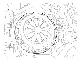 - Loosely tighten every clutch cover bolts, then torque to specifications in a diagonal direction. This can prevent twisting, vibration of the cover, and the lifting of the pressure plate.