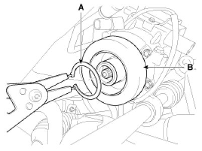 8. Disconnect the retainer ring (A) and then remove the pulley(B).
