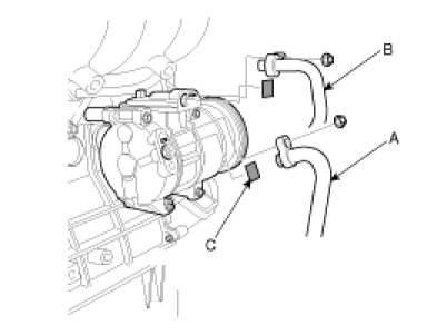 5. Remove the bolts, then disconnect the suction line (A) and discharge line (B) from the compressor. Plug (C) or cap the lines immediately after disconnecting them to avoid moisture and dust contamination.