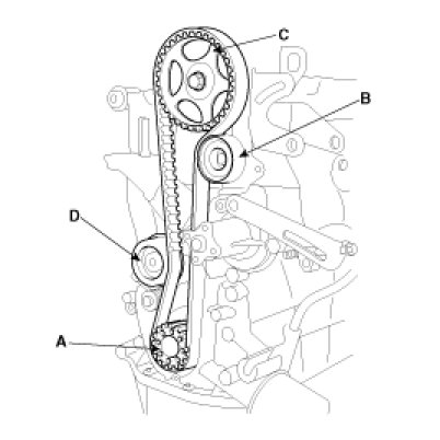 Crankshaft sprocket(A) ->idler pulley(B) ->camshaft sprocket(C) ->timing belt tensioner(D).