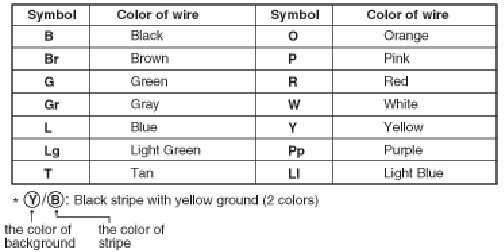 The following abbreviations are used to identify wire colors in the circuit schematics.