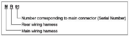A connector identification symbol consists of a wiring harness location classification symbol corresponding to a wiring harness location and number corresponding to the connector.