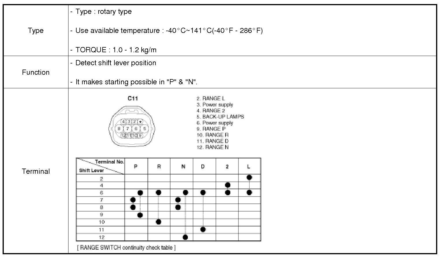 By shifting the selector to the "P" or "N" range, the electrical circuit inside the inhibitor switch is connected to form the ignition circuit with which the engine can be started. When the shift is in the "R" range, the backup lamp lights up as backup lamp circuit is energized.