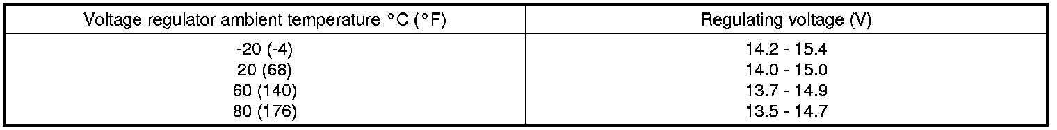 1. If the voltmeter reading agrees with the value listed in the regulating voltage table below, the voltage regulator is functioning correctly. If the reading is other than the standard value, the voltage regulator or the generator is faulty.