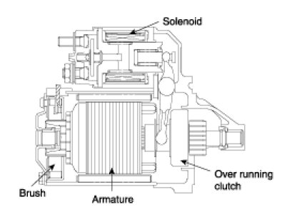 The contacts close and the starter motor cranks. In order to prevent damage caused by excessive rotation of the starter armature when the engine starts, the clutch pinion gear overruns.