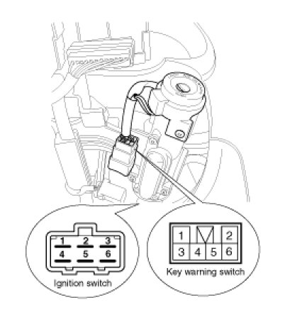 1. Disconnect the ignition switch connector and key warning switch connector from under the steering column.