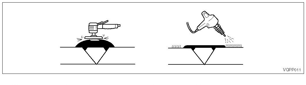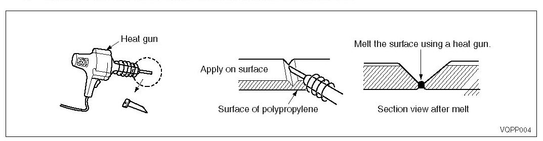 Damage to the bumper that reaches the surface of the polypropylene cannot be fixed just by painting. Use the repair methods shown below to repair damage that reaches the surface of the polypropylene.