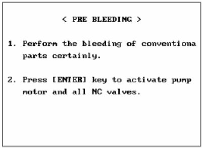 This procedure should be followed to ensure adequate bleeding of air and filling of the ABS unit, brake lines and master cylinder with brake fluid.