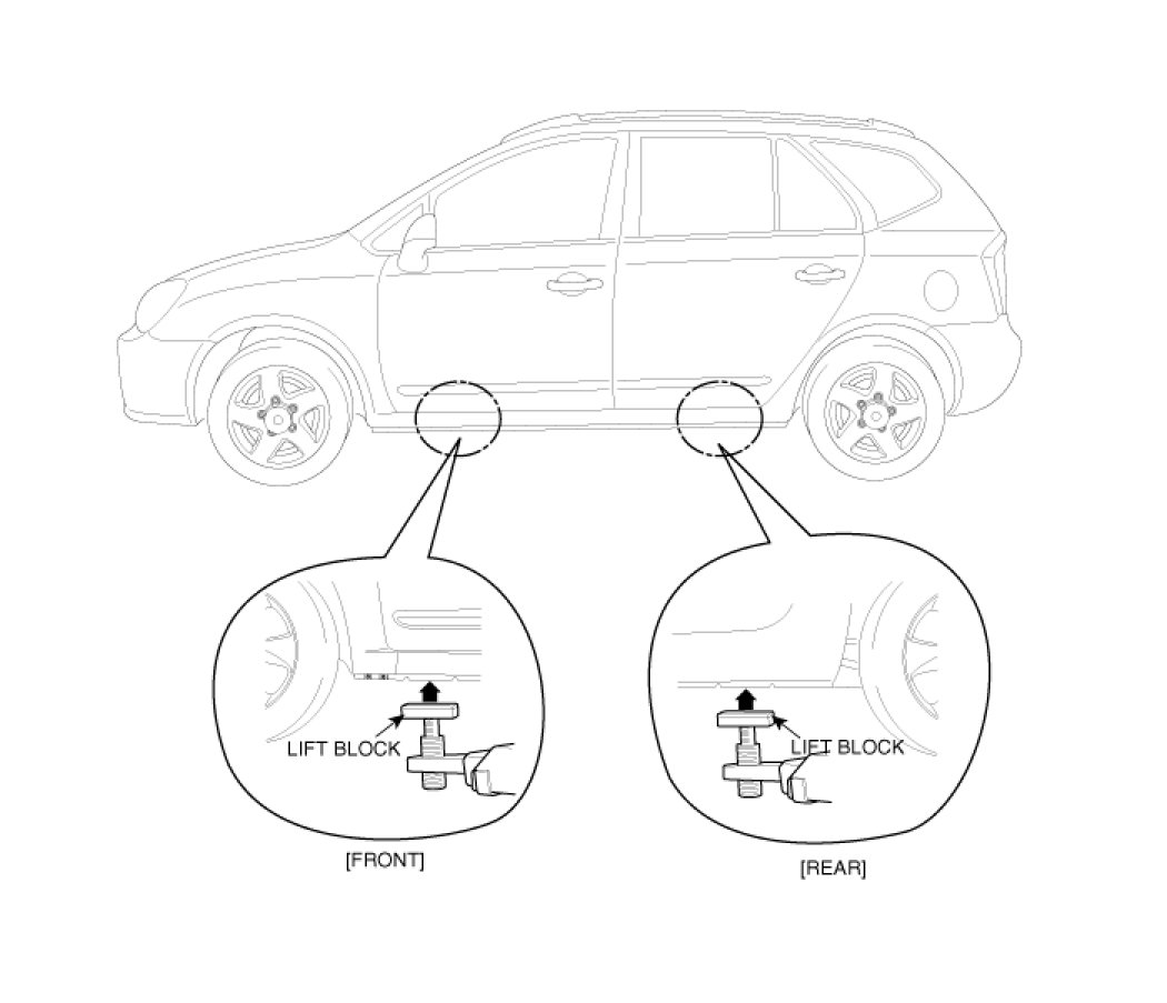 When heavy rear components such as suspension, fuel tank, spare tire, tailgate and trunk lid are to be removed, place additional weight in the luggage area before hoisting. When substantial weight is removed from the rear of the vehicle, the center of gravity may change and can cause the vehicle to tip forward on the hoist.