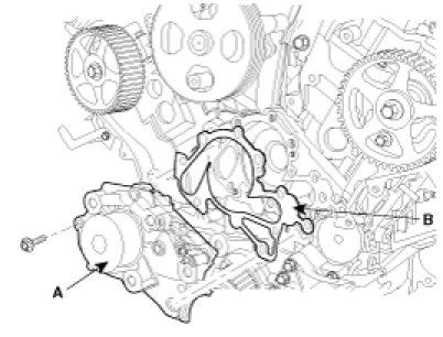 Install the water pump(A) and a new gasket(B) with the bolts.