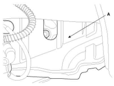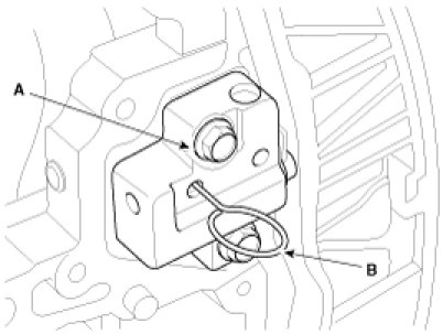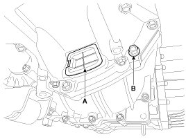 2. Remove the dust cover (A) on the bottom of the ladder frame and unfasten the transaxle mounting bolt (B).