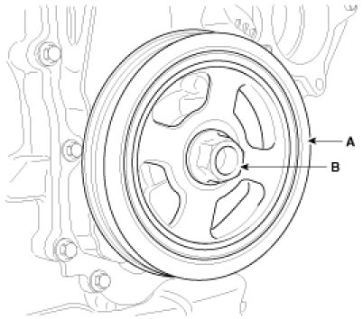 18. Remove the crankshaft bolt(B) and crankshaft pulley(A).