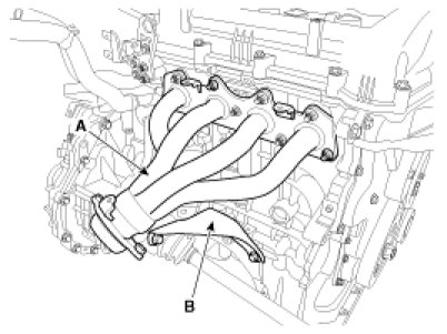 Remove the exhaust manifold stay (B) and the exhaust manifold(A) with its gasket.