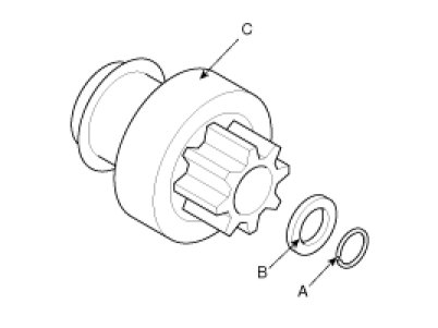 10. Remove the stop ring (A), stopper (B), overrunning clutch (C).