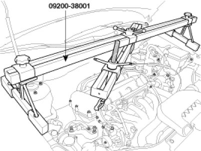 9. Install the special tools (09200-38001), the engine support fixture and the adapter on the engine assembly.