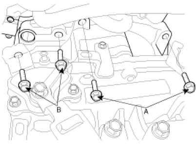2. Install the transaxle lower mounting bolts (A-3ea, B-2ea) after fitting the transaxle assembly into the engine assembly.