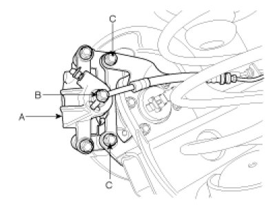 2. Loosen the hose eye-bolt (B) and caliper mounting bolts (C), then remove the rear caliper assembly (A).