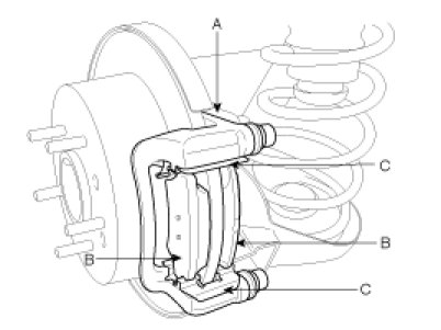 2. Replace pad shim, pad retainers (C) and brake pads (B) in the caliper bracket (A).
