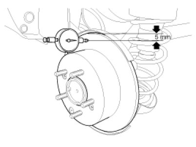 1. Place a dial gauge about 5mm (0.2 in.) from the outer circumference of the brake disc, and measure the runout of the disc.