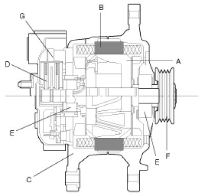 In addition, the charging voltage of the alternator is regulated by the battery voltage detection system. The main components of the alternator are the rotor(A), stator(B), rectifier(C), brushes(D), bearings(E) V-ribbed belt pulley(F). The brush holder contains a built-in electronic voltage regulator(G).