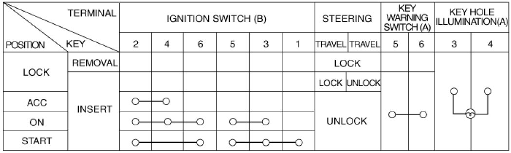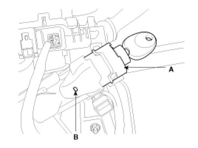 1. Disconnect the ignition switch connector (B) and key warning switch connector (A) from under the steering column.
