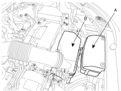 1. Disconnect battery terminals. Remove the air duct (A) and air cleaner assembly (B).
