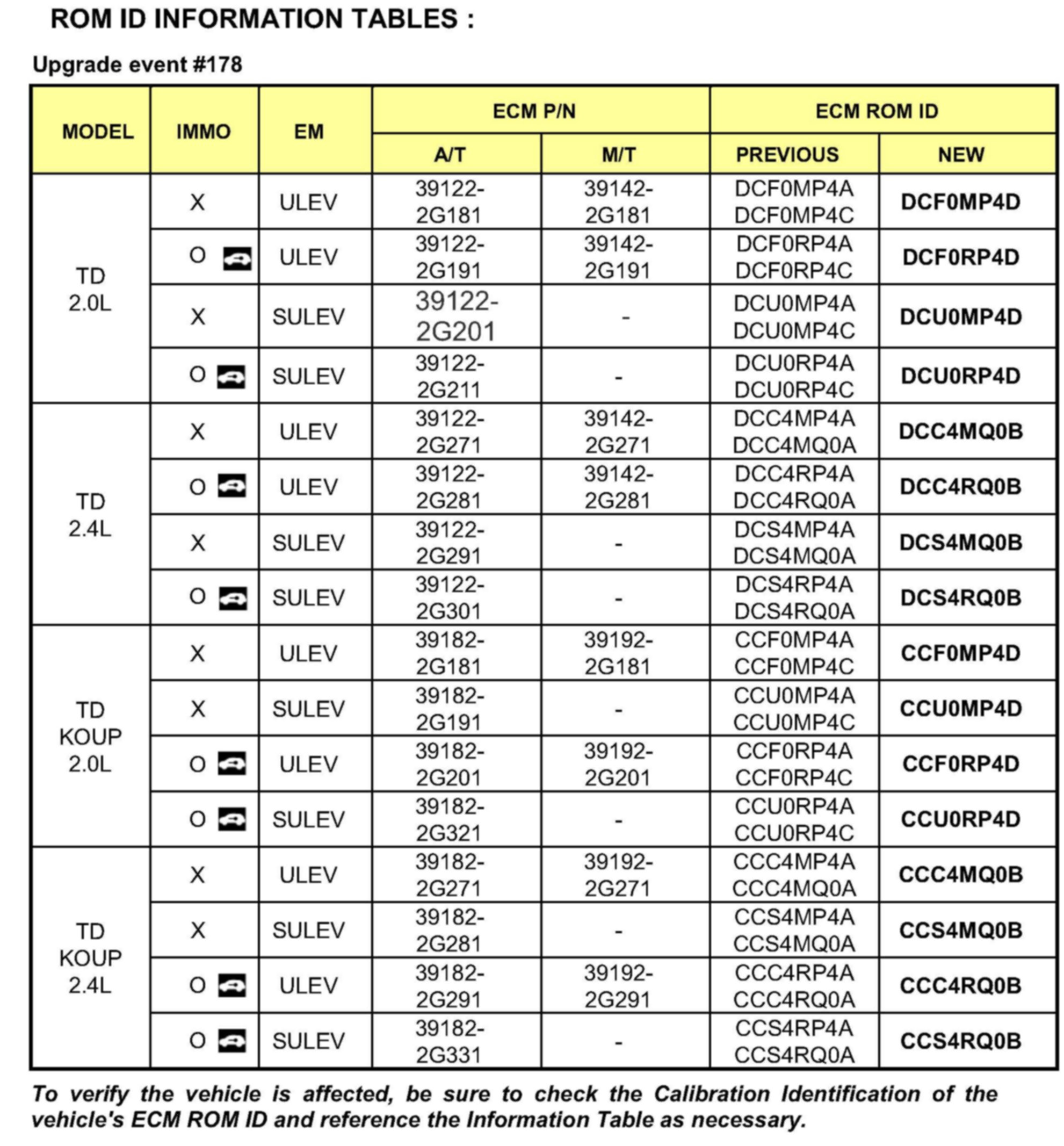 This bulletin provides information related to the ECM software upgrade of some 2012MY Forte/Forte Koup vehicles produced from June 1, 2011 to October 31, 2011 that may experience A/C performance concerns. For confirmation that the latest reflash has been done to a vehicle you are working on verify ROM ID using the tables in this TSB. To ensure maximum customer satisfaction Kia is requesting the completion of this Service Action on all affected 2012MY Forte/Forte Koup vehicles prior to delivery.