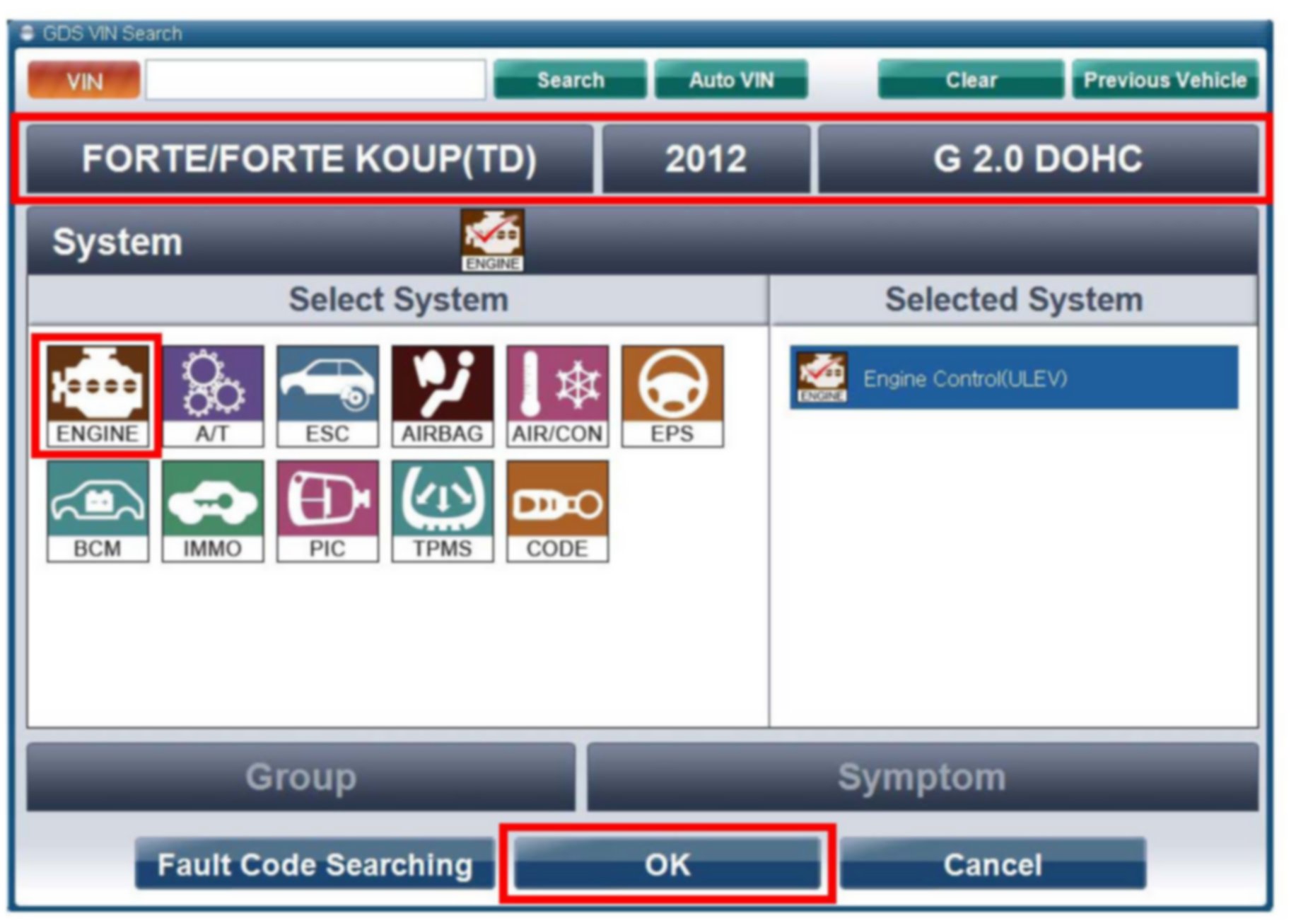 5. With the ignition key ON turn ON the VCI and GDS tool. Access the GDS vehicle identification number (VIN) screen and configure the vehicle using the VIN AUTO DETECT Function.