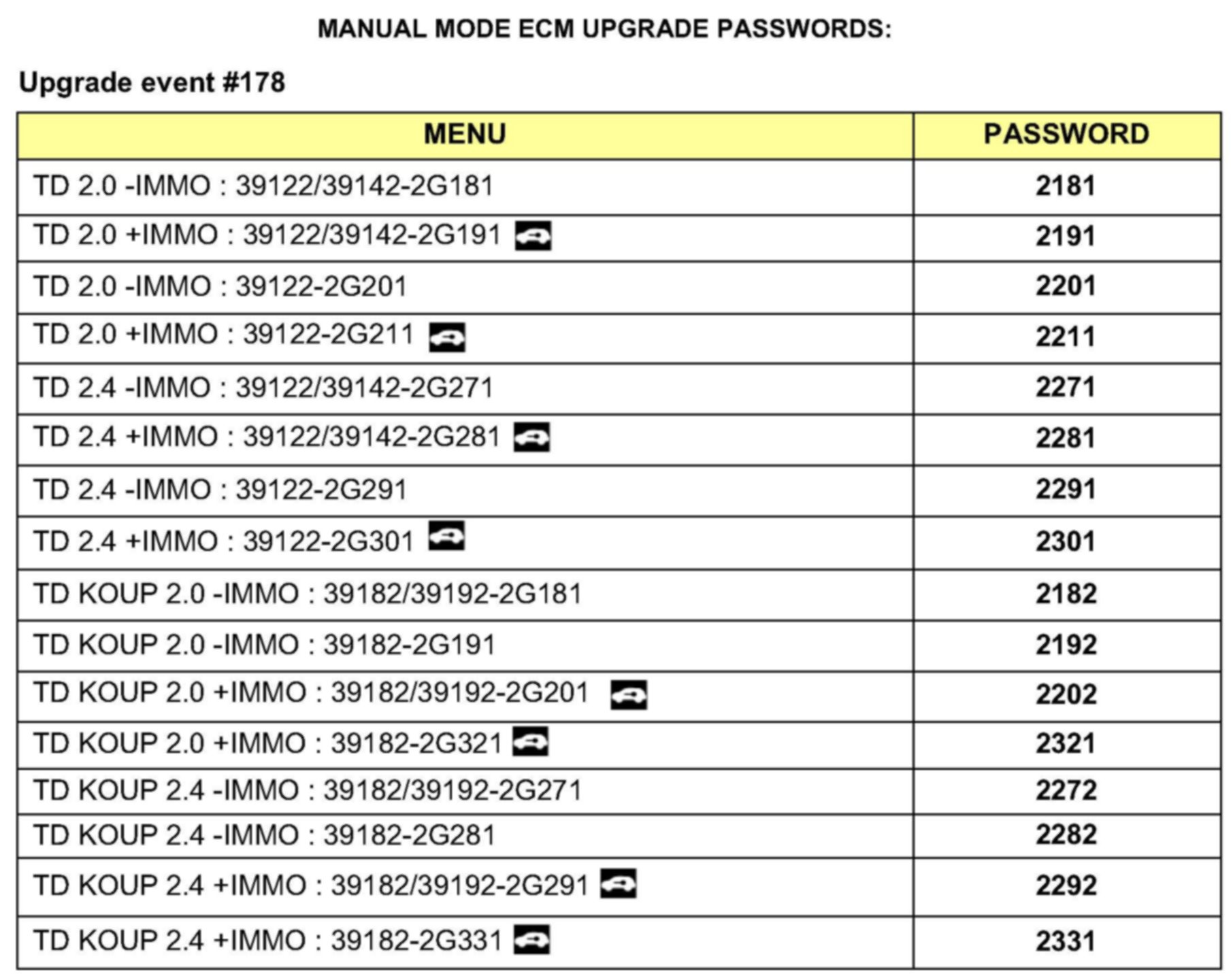 MANUAL MODE ECM UPGRADE PASSWORDS: