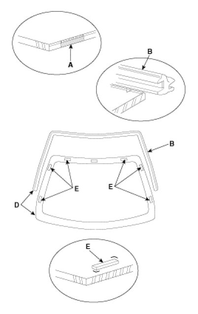 4. When attaching the molding, make it in line (D) with the windshield glass and attach the windshield glass pad (E) to the designated place.