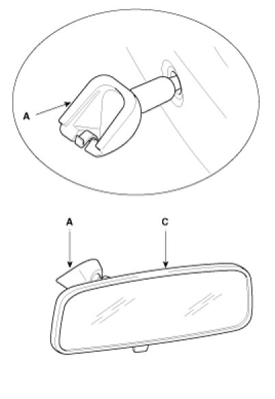 1. Push the inside rear view mirror base (A) up to remove to inside rear view mirror assembly (C).