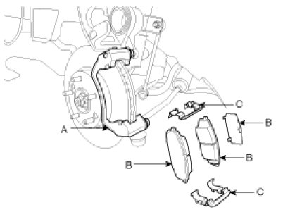 2. Replace pad shim (B), pad retainers (C) and brake pads (B) in the caliper bracket (A).