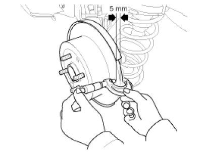 1. Place a dial gauge about 5mm (0.2 in.) from the outer circumference of the brake disc, and measure the runout of the disc.