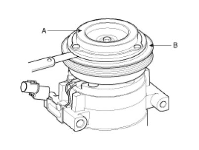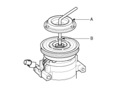 - Be careful not to damage the pulley (B) and compressor during removal/installation.