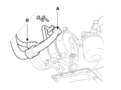 5. Remove the bolts, then disconnect the suction line (A) and discharge line (B) from the compressor. Plug or cap the lines immediately after disconnecting them to avoid moisture and dust contamination.