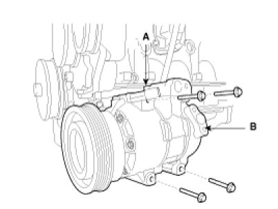 6. Disconnect the compressor clutch connector (A), and then remove 4 mounting bolts and the compressor (B).