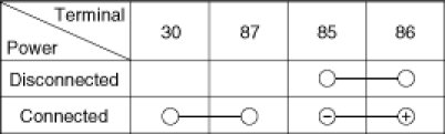 2. There should be continuity between the No.30 and No.87 terminals when power and ground are connected to the No.85 and No.86 terminals.