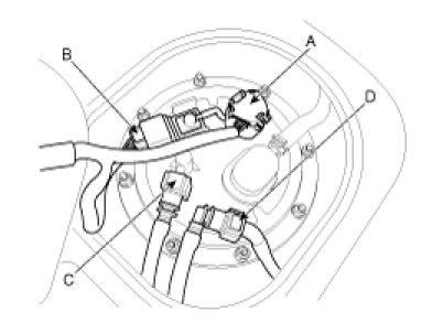 4. Disconnect the fuel pump connector (A) and the fuel tank pressure sensor connector (B).