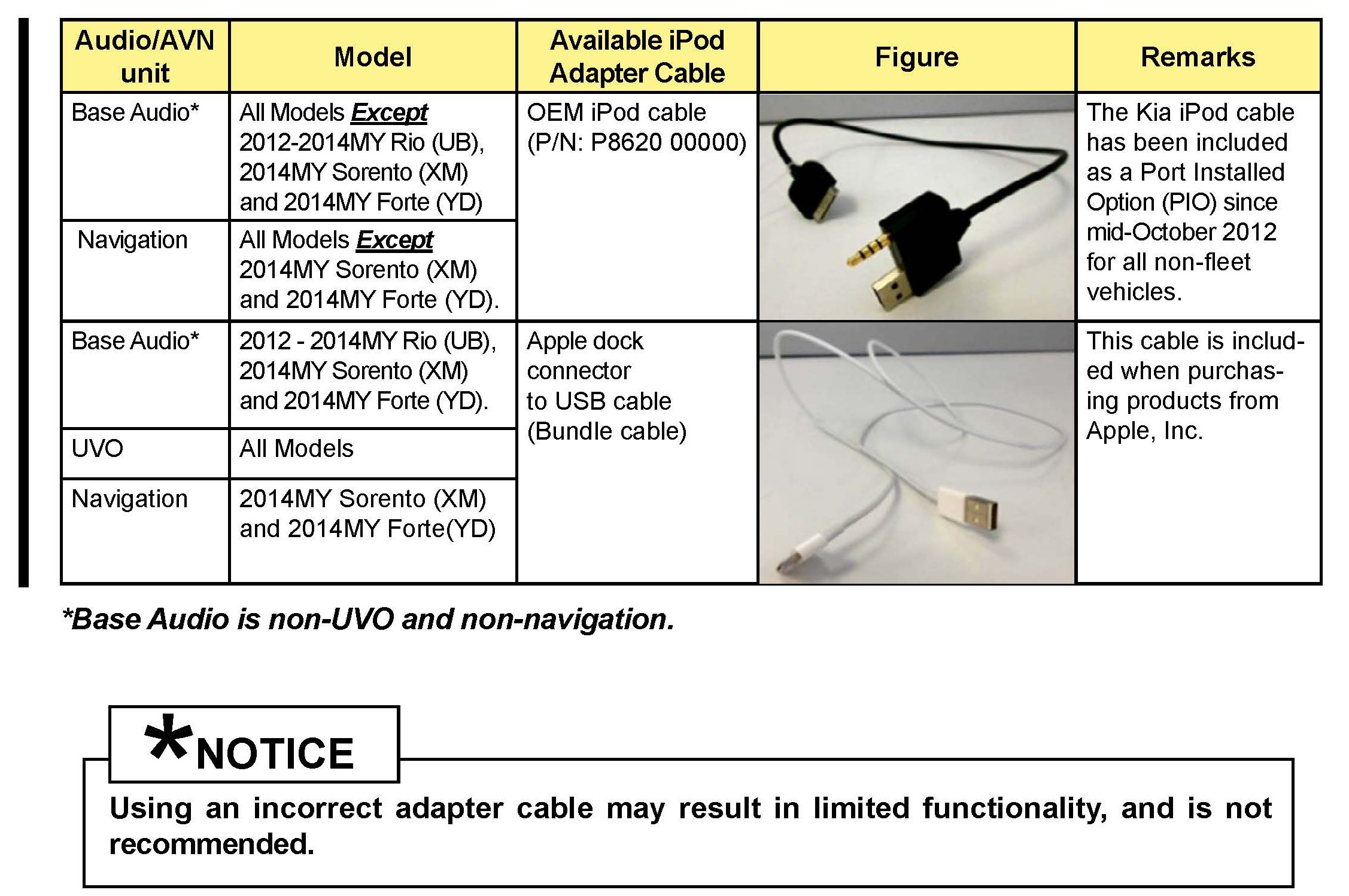 This bulletin provides information regarding iPod adapter cables for Kia vehicles. Specific adapter cable application is dependent on the type of head unit (base audio/navigation/UVO) that a Kia vehicle came equipped with. To ensure proper operation of display and all other features and functions that are available when listening to an iPod device, a specific iPod adapter cable should be used as indicated.