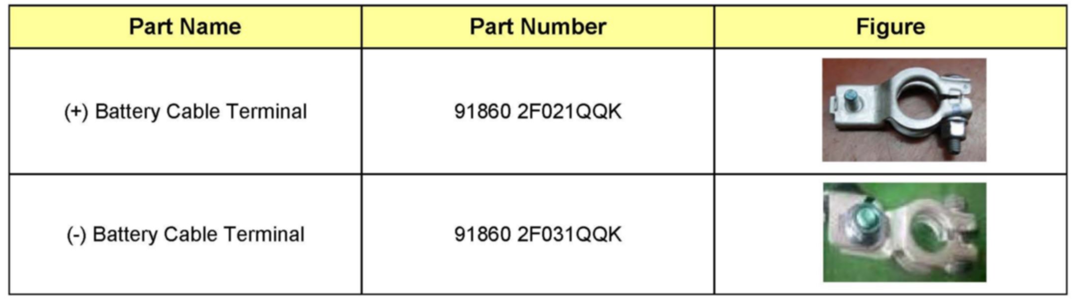 This bulletin provides information relating to the Positive (+) and Negative (-) battery cable terminal replacement on Forte vehicles produced from May 01, 2011 to June 30, 2011. Kia is requesting the completion of this Service Action on all affected 2011/12MY Forte (TD) vehicles prior to delivery. Before conducting the procedure, verify that the vehicle is included in the list of the affected VINs.