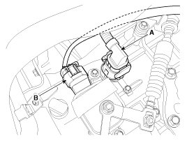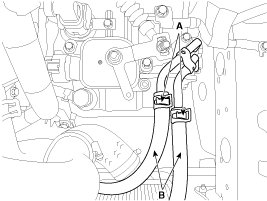 6. Disconnect the hose (B) after removing the automatic transaxle fluid cooler hose clamp (A).