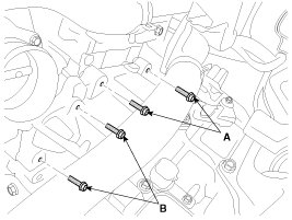 9. Remove the automatic transaxle upper mounting bolt (A-2ea) and the starter motor mounting bolt (B-2ea).