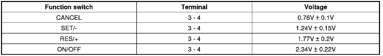 2. Measure voltage between terminals on the harness side connector when each function switch is ON (switch is depressed).
