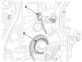 31. Release the ratchet by pulling the link down using a thin rod. Compress the piston and then insert a stopper pin (A) into the hole on the ratchet to hold the compressed piston. Remove the timing chain tensioner (B).