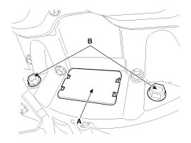 1. Remove the service cover (A) on the bottom of the ladder frame and unfasten the two transaxle mounting bolts (B).