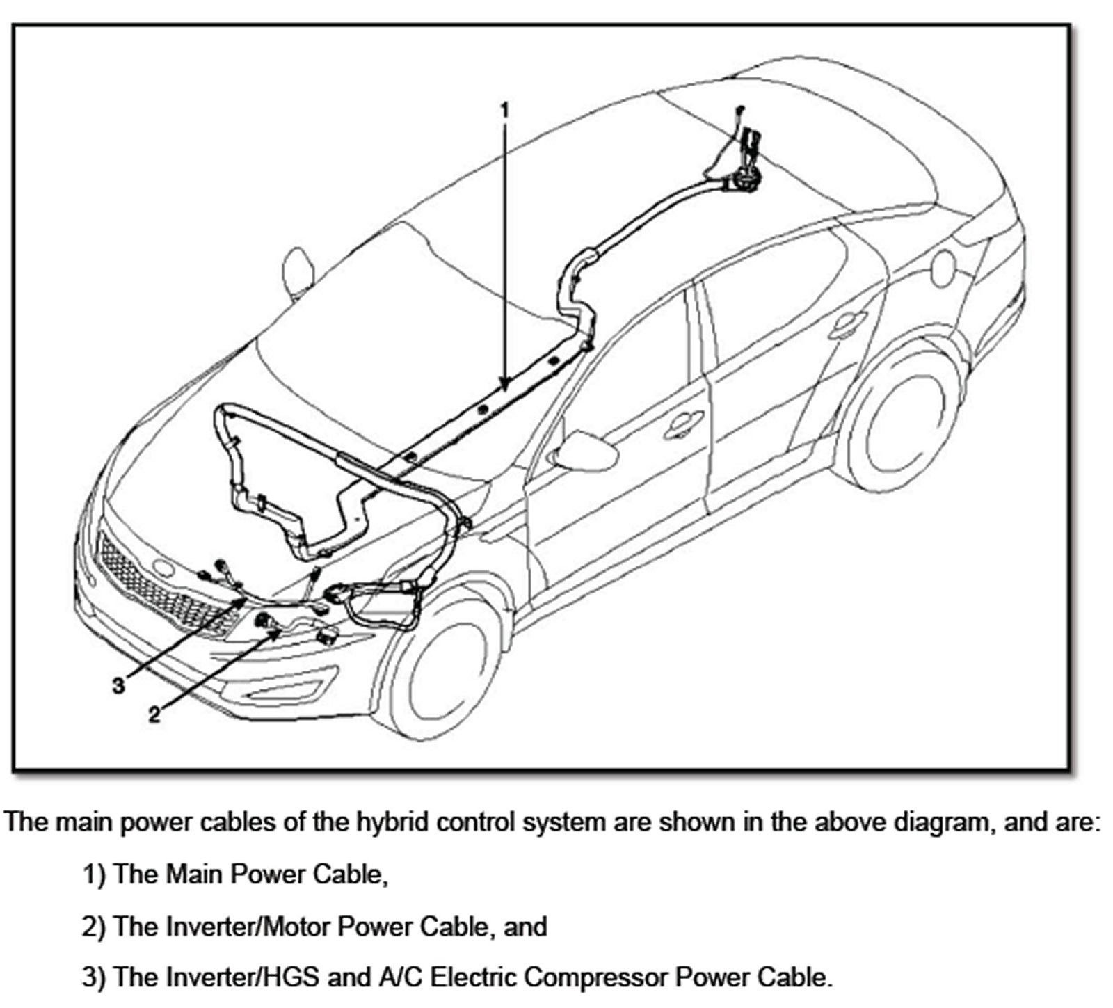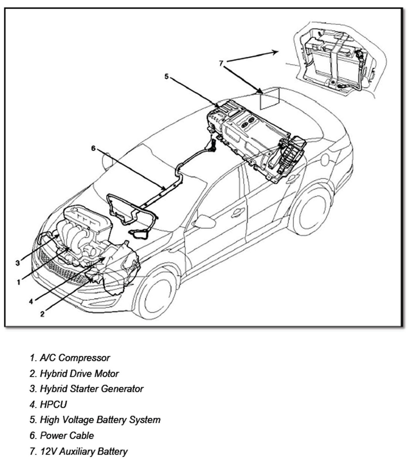 The main high voltage components in the Kia Optima Hybrid are the High Voltage Battery Pack Assembly, the Power Relay Assembly, the Battery Management System ECU, the Hybrid Power Control Unit, the Hybrid Drive Motor, the Hybrid Starter Generator, the Electric A/C Compressor, the Low DC/DC Converter, the Electric Compressor, and Power Cable.
